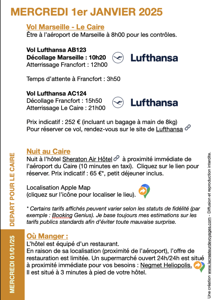 - Un récapitulatif clair des vols, avec horaires précis, temps d’attente, conseils d’arrivée à l’aéroport et liens directs de réservation.