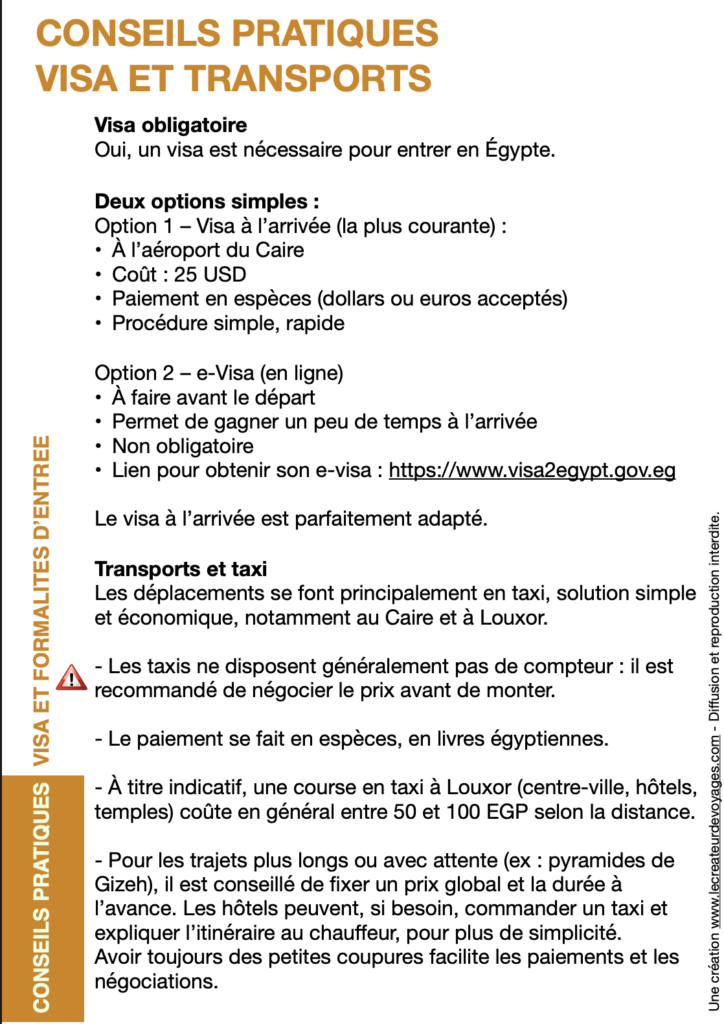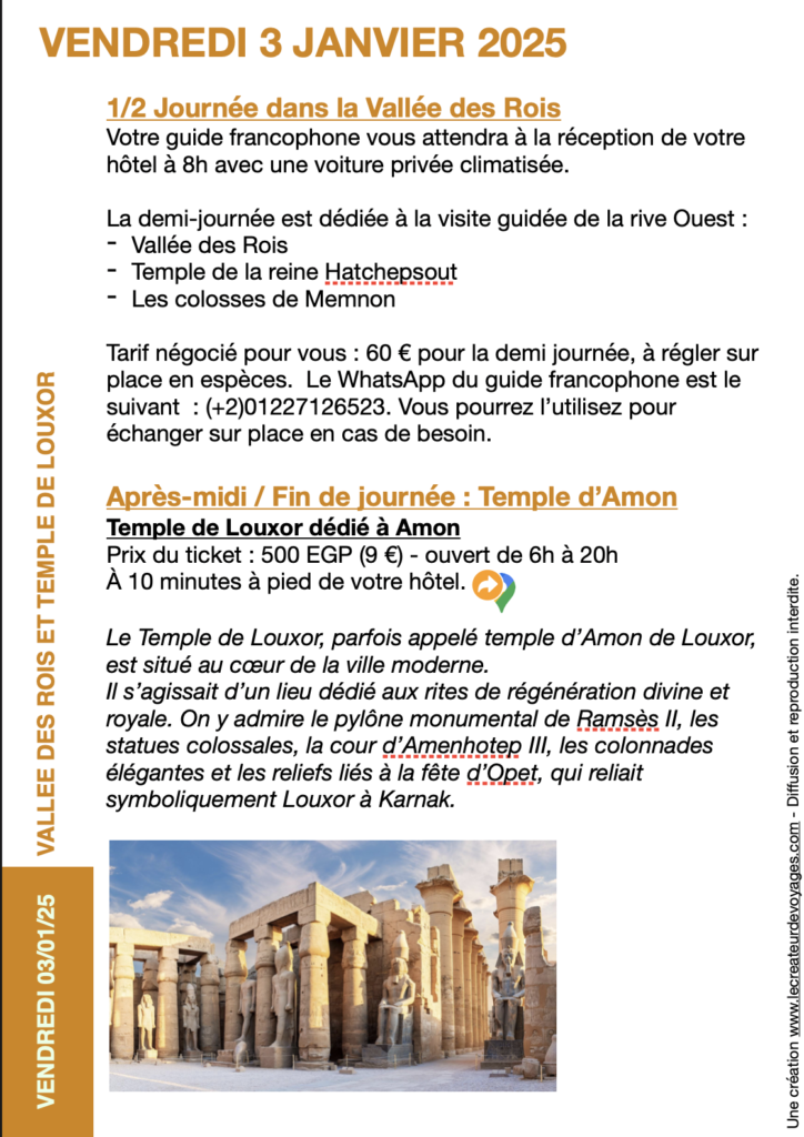 Dans le carnet Égypte, par exemple, chaque site (Karnak, Vallée des Rois, temples, hôtels) est accessible en un clic, transformant le téléphone en véritable boussole de voyage .